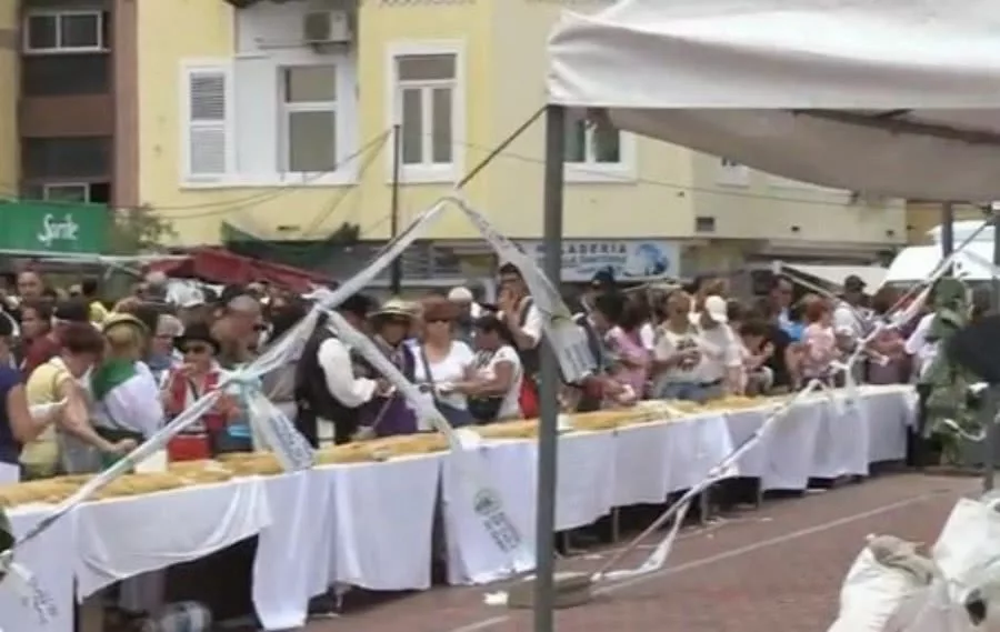 y otros centros educativos de Gran Canaria en la Plaza de La Puntilla. El récord se ha conseguido con una pella que ha necesitado de más de 1000 kilos de gofio, 500 litros de agua, 40 kilos de azúcar y los mismos de sal. Además, la pella kilométrica ha sido de sabores, en concreto de siete. Plátanos, ron miel, queso tierno, chorizo de Teror, miel isleña, suspiros de Mota y mojo rojo le han dado el toque especial a esta pella de la que han disfrutado varios cientos de grancanarios.