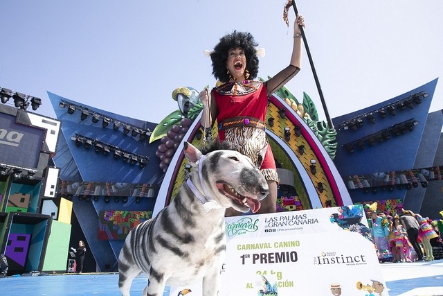 Primer premio: El bull terrier miniatura Milka, de un año y tres meses y con su fantasía – Desde la selva más salvaje llegan Milka y Eva a disfrutar del Carnaval carioca -, diseñada por Eva León