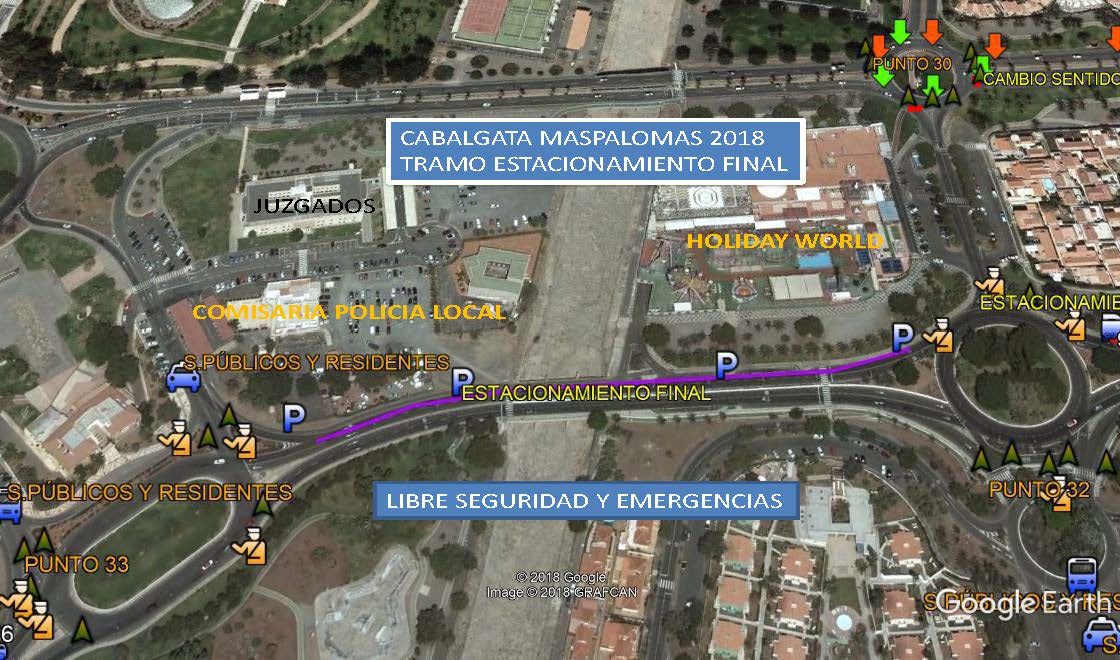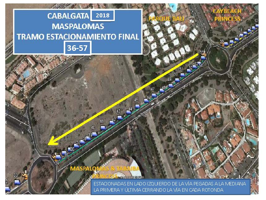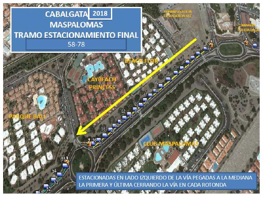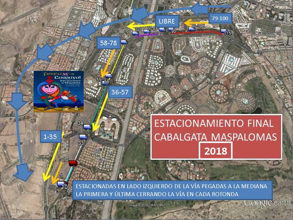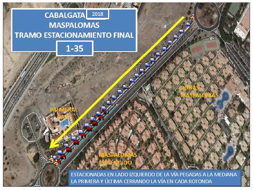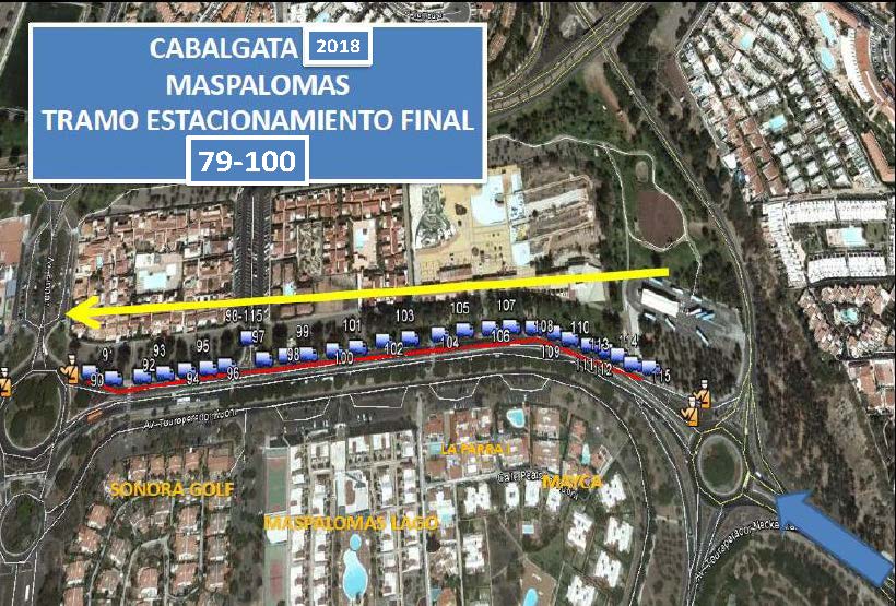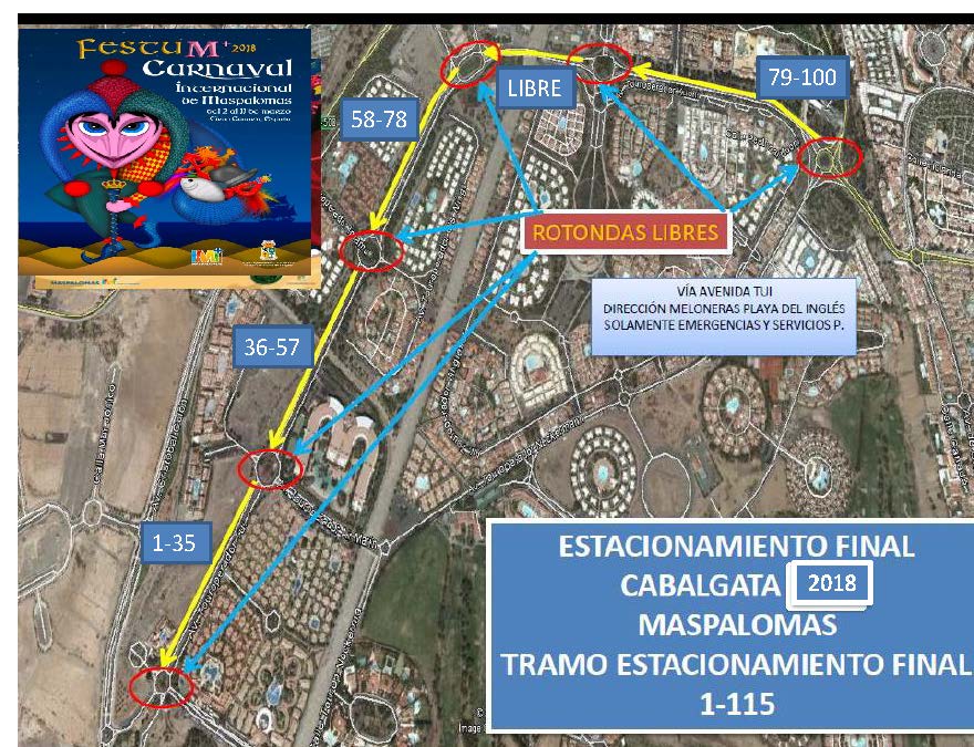 Apartado QUINTO de las mencionadas bases, señala que se ha dispuesto de un gran espacio a los que deben trasladarse aquellas carrozas que deseen estacionarse, se trata del aparcamiento/estacionamiento final que será únicamente en la Avenida Touroperador Tui, (frente al antiguo Ocean Park. como continuación lineal de la Cabalgata), desde la rotonda de la intersección con Avenida Tourperador Neckermann, en ambas direcciones y sentidos, hasta la rotonda dela intersección con la Calle Touroperador Sunnair (Maspalomas Espléndido/ Parque Toni Gallardo Maspalomas). Ampliando el circuito cerrado de Ia Cabalgata. La circulación por las citadas vías pública deberá ajustarse a la legislación vigente en materia de tráfico y seguridad vial. estableciéndose expresamente que QUEDA TOTALMENTE PROHIBIDO EL ESTACIONAMIENTO DE CARROZAS EN LUGARES DISTINTOS DEL ESPACIO HABILITADO QUE SE CITA EN EL APARTADO ANTERIOR» siendo la Policía Local la que velará por el estricto cumplimiento de lo estipulado en las bases, procediendo a denunciar todas aquellas infracciones que detecten.