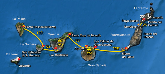 Fred Olsen desde Gran Canaria hasta Tenerife y Tenerife hasta Gran Canaria; Gran Canaria hasta Fuerteventura y Fuerteventura hasta Gran Canaria.